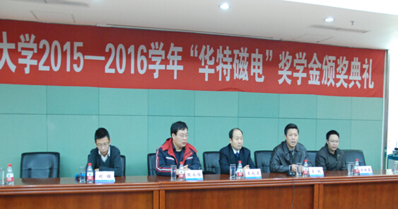2015年12月25日,東北大學“華特磁電”獎學金頒獎典禮于東北大學漢卿會堂舉行,這是自去年設立華特獎學金以來第二次頒獎。公司董事長兼總裁王兆連、技術中心電器部經理劉世昌、電器工程師張永信,東北大學校友總會、校董會、基金會管理辦公室主任李鶴、資源與土木工程學院黨委副書記兼副院長劉維、獲獎學生及礦物加工工程專業學生代表等參加了會議。